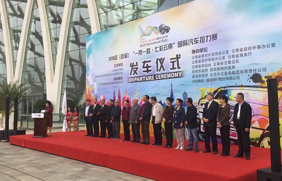 王义明主席主持了本次发车仪式,常林副局长、李军副主席在发车仪式上致辞。刀林荫副主任向车队队长授予拉力赛队旗,同时宣布2016“一带一路·七彩云南”国际汽车拉力赛正式启程,省老领导祁山和三个国家的驻昆总领事挥旗为赛事发车。