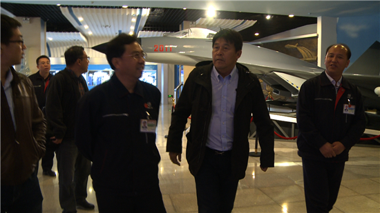 沈飞集团工会主席王恩富(右三)陪同迟尚斌主席一行参观航空博览园